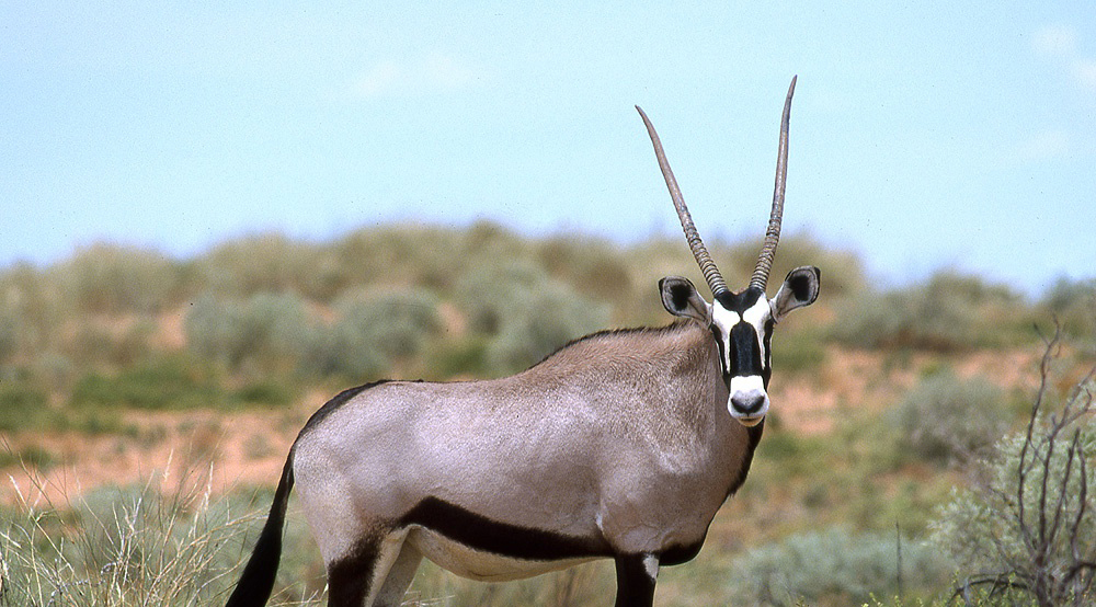 The Gemsbok is a large antelope of striking appearance with long, spear like horns. It has a thick, horse like neck with a short mane and a compact, muscular body.